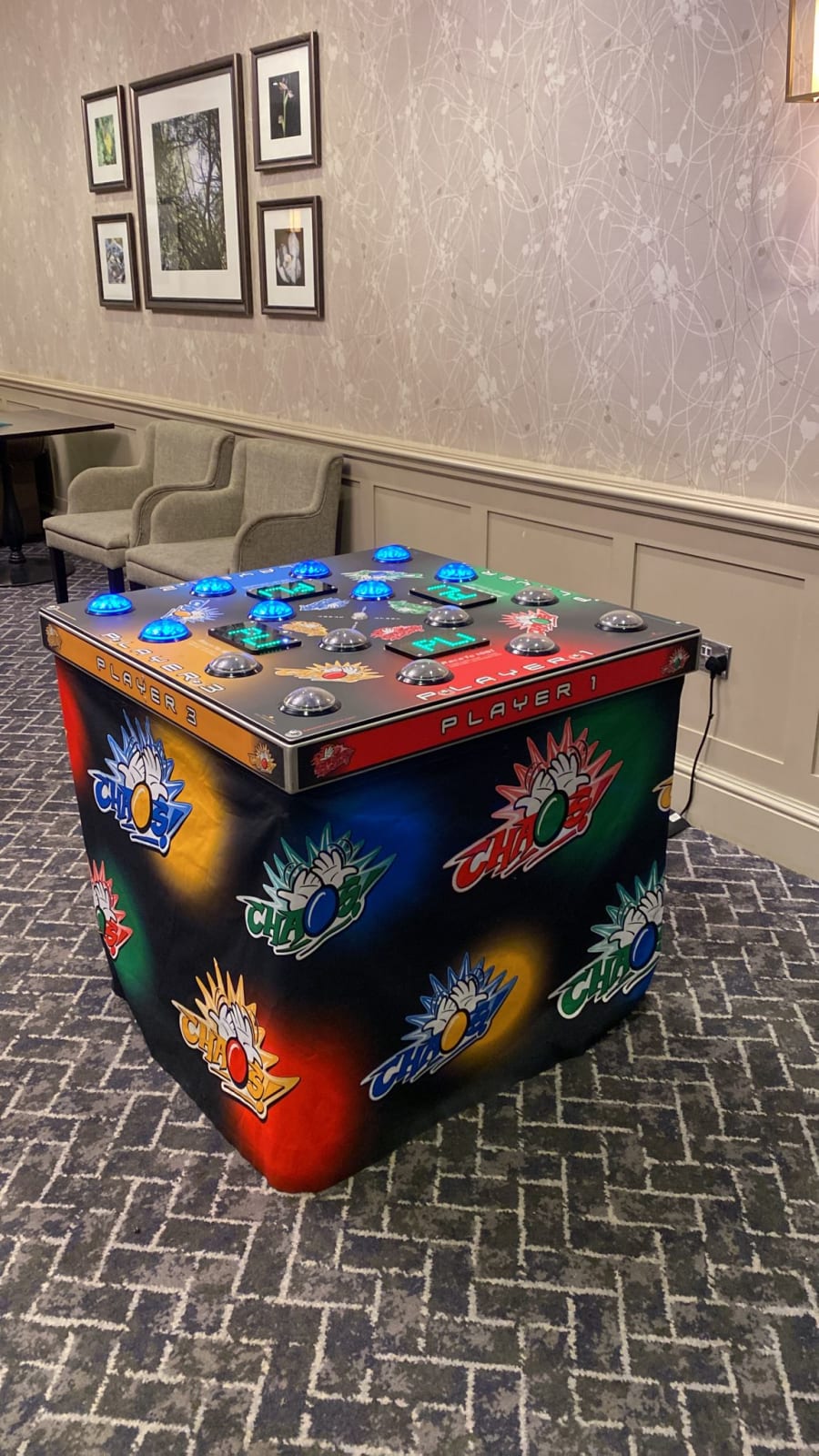 Chaos combines the excitement of the Strike A Light reaction game with the twist of the lights being able to change colour. Each player will try to hit the lights corresponding with their colour of the board. The light up colours move around the board, creating chaos for all the players. The only game that caters to everyone. We also offer a 2 player version of Chaos 4 called strike a light. Why not watch our promotional video on the 2 player version, you are able to get a better idea of how the game plays out and also watch the chaos unfold.